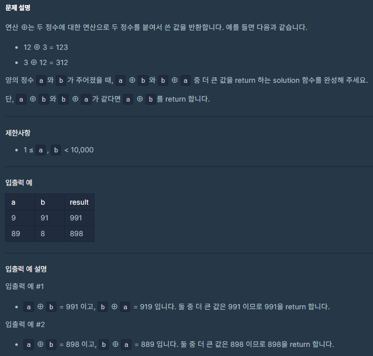 - 정수 a, b를 받아서 두 수를 서로 다른 순서로 이어 붙인 값 중 큰 수를 반환하는 메서드